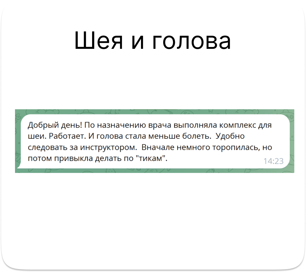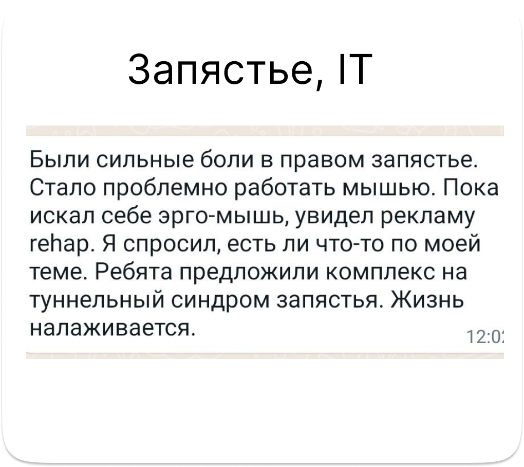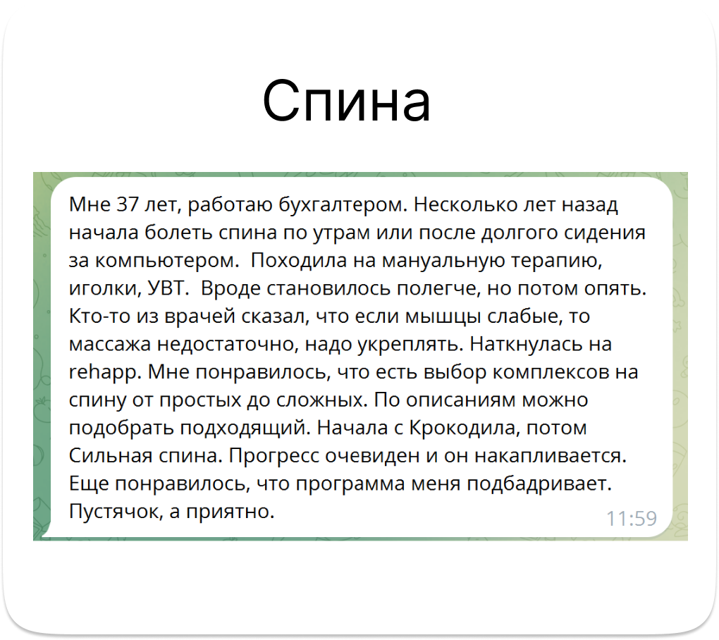 Наше приложение нацелено на достижение оптимальной физической формы, в том числе при таких состояниях как «ноющая поясница», «запястье ITшника» (capral tunnel syndrome), «шея студента» (tech neck), «колено бегуна», «синдром грушевидной мышцы», «локоть теннисиста/гольфиста», «пяточная шпора» и т.п.)*